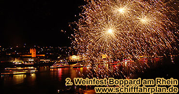 Weinfest-Veranstaltungen 2026 2027 am Mittelrhein zwischen Koblenz und Rüdesheim 2 Feuerwerk-Schifffahrten auf dem Rhein mit reserviertem Sitzplatz, DJ-Musik und Tanz. Sonntag, 6. September 2026 Weinfest-Feuerwerk Winningen Mosel mit Abfahrt in Koblenz Rhein, Ticket inkl. Buffet 66 EUR. Samstag, 3. Oktober 2026 Weinfest-Feuerwerk Boppard am Rhein mit Abfahrt in Vallendar und Koblenz, Ticket inkl. Abendessen 56 EUR.